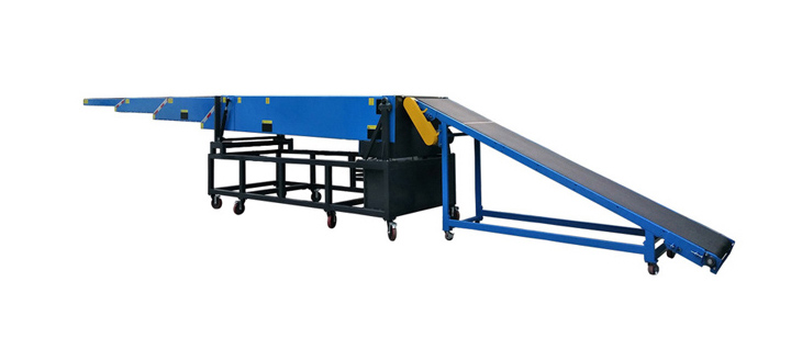 伸縮皮帶輸送機(又名伸縮裝車機),增加了儲帶裝置和收放皮帶裝置,通過一個操作桿或操作按鈕即可實現在長度方向上自由伸縮,隨時控制輸送機的長度,通過任意的伸縮運動,完成貨物的輕松高效裝卸。